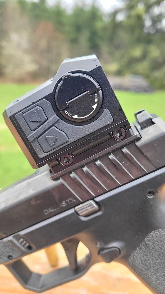 It sits low enough, keeping the pistol balanced without that front-heavy feel. The aluminum body feels bombproof, the buttons are positive, and the touchscreen responds cleanly. Power on is lightning fast thanks to InstaWake. No waiting around when you're in a hurry. Auto brightness handles transitions well enough.