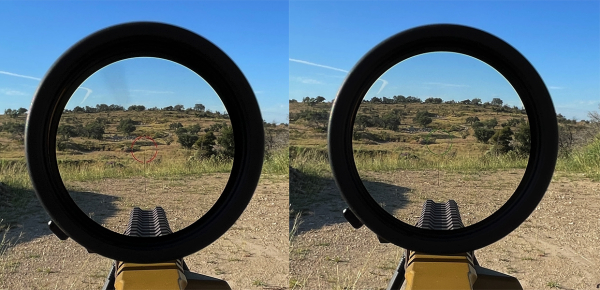 As you can see above, light transmission is excellent, as is edge-to-edge clarity. There's virtually zero color shift. While it doesn't show well in the photos, the illuminated circles are easily visible at maximum brightness in full daylight.